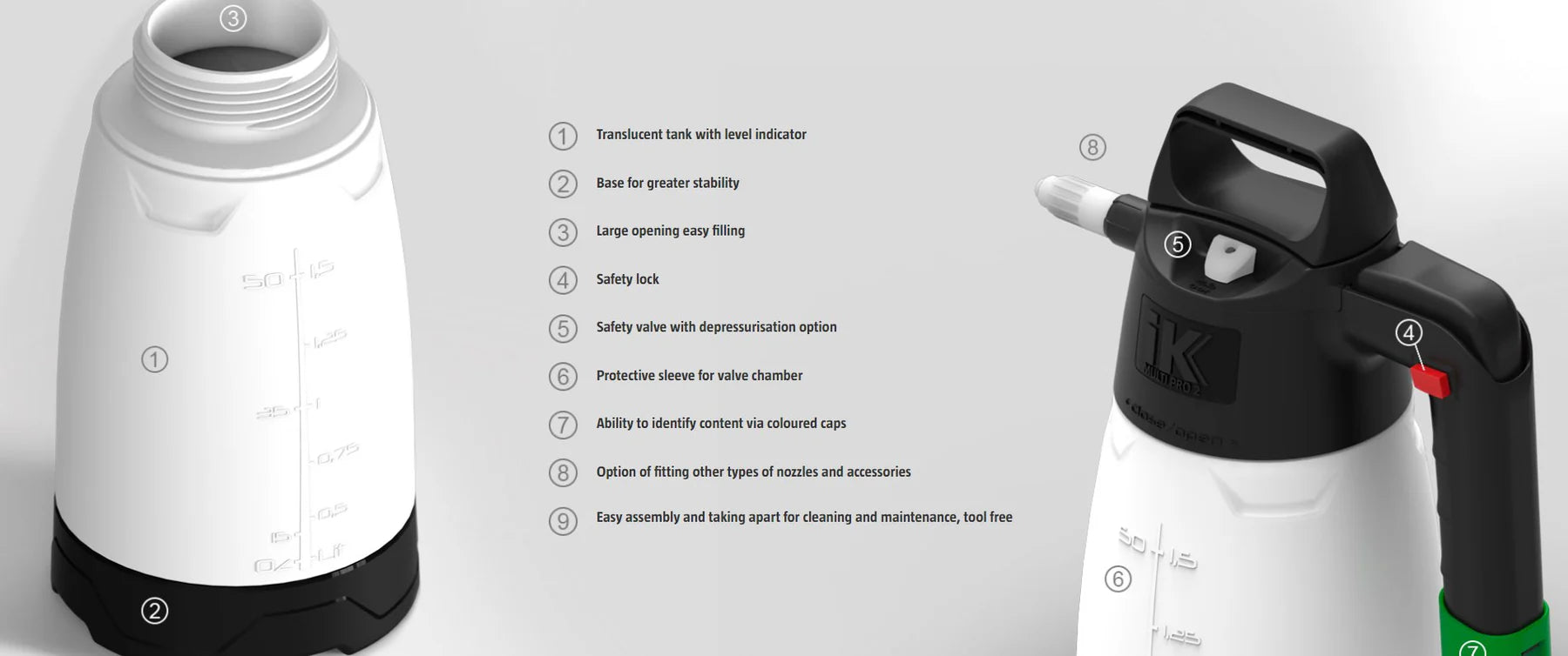 Les joints et les matériaux d’IK Multi Pro 2 sont particulièrement résistants à la plupart des acides, des solvants et des produits désinfectants. Il inclut une large ouverture de remplissage, une conception ergonomique, une soupape de sécurité tarée à 2,5 bar (dépressurisable), une base large pour plus de stabilité, une signalétique de couleurs couleurs pour l’identification du contenu du réservoir, un verrouillage de sécurité du système d’ouverture et de fermeture et deux buses de pulvérisation (conique réglable et éventail).
